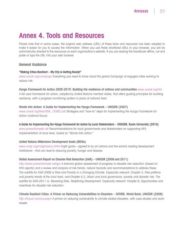 Annex 4. Tools and Resources Please note that in some cases, the original web address (URL) of these tools and resources has been adapted to make it easier for you to access the information. When you use these shortened URLs in your browser, you will be automatically directed to the resources on each organisation’s website. If you are reading the Handbook offline, cut and paste or type the URL into your web browser.