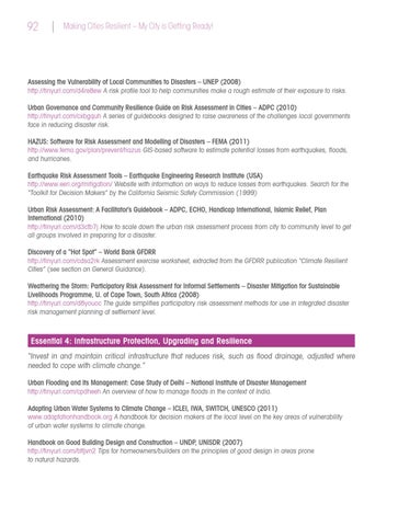 Assessing the Vulnerability of Local Communities to Disasters – UNEP (2008) http://tinyurl.com/d4re8ew A risk profile tool to help communities make a rough estimate of their exposure to risks. Urban Governance and Community Resilience Guide on Risk Assessment in Cities – ADPC (2010) http://tinyurl.com/cxbgquh A series of guidebooks designed to raise awareness of the challenges local governments face in reducing disaster risk. HAZUS: Software for Risk Assessment and Modelling of Disasters – FEMA (2011) http://www.fema.gov/plan/prevent/hazus GIS-based software to estimate potential losses from earthquakes, floods, and hurricanes. Earthquake Risk Assessment Tools – Earthquake Engineering Research Institute (USA) http://www.eeri.org/mitigation/ Website with information on ways to reduce losses from earthquakes. Search for the “Toolkit for Decision Makers” by the California Seismic Safety Commission (1999) Urban Risk Assessment: A Facilitator’s Guidebook – ADPC, ECHO, Handicap International, Islamic Relief, Plan International (2010) http://tinyurl.com/d3cfb7j How to scale down the urban risk assessment process from city to community level to get all groups involved in preparing for a disaster. Discovery of a “Hot Spot” – World Bank GFDRR http://tinyurl.com/cdsa2rk Assessment exercise worksheet, extracted from the GFDRR publication “Climate Resilient Cities” (see section on General Guidance). Weathering the Storm: Participatory Risk Assessment for Informal Settlements – Disaster Mitigation for Sustainable Livelihoods Programme, U. of Cape Town, South Africa (2008) http://tinyurl.com/d8youoc The guide simplifies participatory risk assessment methods for use in integrated disaster risk management planning at settlement level.