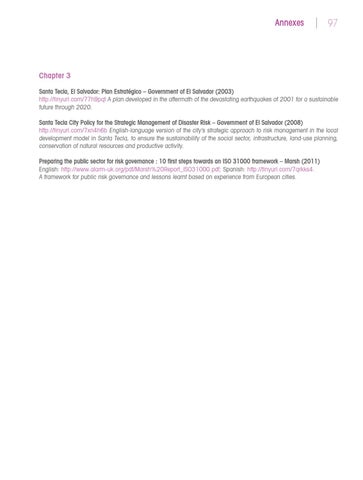Chapter 3 Santa Tecla, El Salvador: Plan Estratégico – Government of El Salvador (2003) http://tinyurl.com/77h9pqt A plan developed in the aftermath of the devastating earthquakes of 2001 for a sustainable future through 2020. Santa Tecla City Policy for the Strategic Management of Disaster Risk – Government of El Salvador (2008) http://tinyurl.com/7xn4h6b English-language version of the city’s strategic approach to risk management in the local development model in Santa Tecla, to ensure the sustainability of the social sector, infrastructure, land-use planning, conservation of natural resources and productive activity. Preparing the public sector for risk governance : 10 first steps towards an ISO 31000 framework – Marsh (2011) English: http://www.alarm-uk.org/pdf/Marsh%20Report_ISO31000.pdf; Spanish: http://tinyurl.com/7qrkks4. A framework for public risk governance and lessons learnt based on experience from European cities.