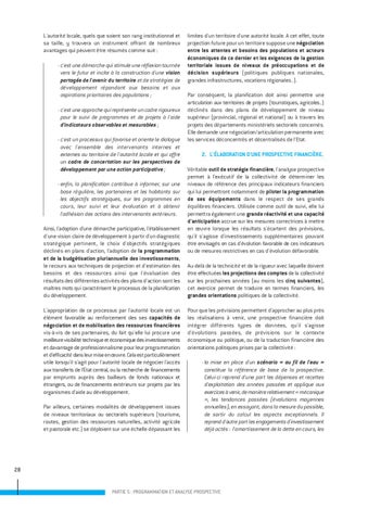 limites d'un territoire d'une autorité locale. A cet effet, toute projection future pour un territoire suppose une négociation entre les attentes et besoins des populations et acteurs économiques de ce dernier et les exigences de la gestion territoriale issues de niveaux de préoccupations et de décision supérieurs (politiques publiques nationales, grandes infrastructures, vocations régionales..). Par conséquent, la planification doit ainsi permettre une articulation aux territoires de projets (touristiques, agricoles..) déclinés dans des plans de développement de niveau supérieur (provincial, régional et national) ou à travers les projets des départements ministériels sectoriels concernés. Elle demande une négociation/articulation permanente avec les services déconcentrés et décentralisés de l'Etat. 2. L'ÉLABORATION D'UNE PROSPECTIVE FINANCIÈRE. Véritable outil de stratégie financière, l'analyse prospective permet à l'exécutif de la collectivité de déterminer les niveaux de référence des principaux indicateurs financiers qui lui permettront notamment de piloter la programmation de ses équipements dans le respect de ses grands équilibres financiers. Utilisée comme outil de suivi, elle lui permettra également une grande réactivité et une capacité d'anticipation accrue sur les mesures correctrices à mettre en œuvre lorsque les résultats s'écartent des prévisions, qu'il s'agisse d'investissements supplémentaires pouvant être envisagés en cas d'évolution favorable de ces indicateurs ou de mesures restrictives en cas d'évolution défavorable. Au-delà de la technicité et de la rigueur avec laquelle doivent être effectuées les projections des comptes de la collectivité sur les prochaines années (au moins les cinq suivantes), cet exercice permet de traduire en termes financiers, les grandes orientations politiques de la collectivité. Pour que les prévisions permettent d'approcher au plus près les réalisations à venir, une prospective financière doit intégrer différents types de données, qu'il s'agisse d'évolutions passées, de prévisions sur le contexte économique ou politique, ou de la traduction financière des orientations politiques prises par la collectivité : - la mise en place d'un scénario « au fil de l'eau » constitue la référence de base de la prospective. Celui-ci reprend d'une part les dépenses et recettes d'exploitation des années passées et applique aux exercices à venir, de manière relativement « mécanique », les tendances passées (évolutions moyennes annuelles), en essayant, dans la mesure du possible, de sortir du calcul les aspects exceptionnels. Il reprend d'autre part les engagements d'investissement déjà actés : l'amortissement de la dette en cours, les