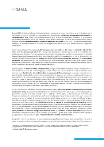 Depuis 2002, l'Institut de la Gestion Déléguée s'attache à promouvoir, au niveau international, un cadre de gouvernance clarifié pour les services essentiels. Les principes en sont explicités dans la Charte des services essentiels esquissée à Johannesburg en 2002. Grâce à une collaboration étroite avec le Ministère des Affaires Etrangères et de nombreux partenaires internationaux, l'IGD et ses membres, réunis dans le Comité pour la Charte, ont activement œuvré jusqu'à l'adoption officielle d'un cadre de référence par les Etats membres d'ONU-Habitat en avril 20071. Les modalités opérationnelles de sa mise en œuvre sont désormais discutées avec les agences des Nations Unies et les autres acteurs de la coopération internationale. Au sein de ce cadre de référence, les autorités locales se voient reconnaître un rôle moteur pour atteindre l'objectif d'un accès pour tous aux services essentiels2, synonyme de développement économique pour tous et d'amélioration des conditions de vie de chacun. Parce qu'elles sont en contact direct avec les besoins quotidiens de la population, les autorités locales disposent de la plus grande légitimité pour choisir les modalités les plus adaptées en vue de desservir tous les quartiers et tous les habitants. Pour cela, les autorités locales doivent pouvoir compter sur le concours de l'ensemble des partenaires : les représentants de l'Etat ; les opérateurs des services essentiels, que ceux-ci soient publics, privés, ou bien émanent de la société civile ; et les usagers eux-mêmes, à travers les associations qui les représentent et sont les mieux à même d'apprécier la pertinence et l'efficacité des services rendus. La préoccupation du renforcement des autorités locales, partagée par l'ensemble des acteurs, est aussi celle de l'IGD, qui a notamment mis en place des « Quadrilogues pour l'accès de tous aux services essentiels »3. Ce renforcement inclut nécessairement l'amélioration des conditions d'accès aux sources de financement, pour les services essentiels comme pour l'ensemble des activités des autorités locales. Les obstacles pour y parvenir sont nombreux, mais ils sont techniquement surmontables, et de nombreuses études ont montré que l'épargne mobilisable est généralement présente dans toutes les régions du monde, et souvent en quantité importante. Il est toutefois bien connu que les flux monétaires reposent sur la confiance, fiducia en latin. Il s'agit sans aucun doute d'une des priorités pour favoriser l'accès des autorités locales aux financements, avec la création d'un cadre institutionnel et réglementaire adéquat : comment consolider la confiance entre ces autorités et les détenteurs des capitaux dont celles-ci ont besoin ? Du côté des financeurs, des efforts sont certainement attendus pour mieux comprendre le contexte et les particularités des autorités locales. L'association mondiale Cités et Gouvernements Locaux Unis (CGLU), qui a activement pris part aux présents travaux, a fait du développement de l'accès au crédit des autorités locales un des axes majeurs de son action. La très grande implication des acteurs français du financement, banques et organismes de coopération ayant chacun une expérience avérée et pratique du contexte international4, dans le groupe de travail mis en place par l'IGD, est un signe favorable qui va dans le sens de ce rapprochement. Du côté des autorités locales, et notamment de celles de taille petite ou moyenne, il existe également un grand besoin de formation en matière de gestion budgétaire et financière, afin de partager avec leurs partenaires financiers un langage commun et de discuter de manière équilibrée des enjeux financiers futurs de leur développement. Des rencontres tenues lors du Sommet Africités 4, à Nairobi en septembre 2006, ont permis de constater que ce besoin était largement exprimé par les élus et techniciens locaux eux-mêmes. Il fallait donc trouver l'outil permettant de faciliter le dialogue entre autorités locales et partenaires financiers extérieurs et de diminuer le sentiment d'incompréhension entre ces deux mondes qui ne peuvent s'ignorer : c'est à cette mission que s'est employé le groupe de travail en proposant un « guide d'autoévaluation financière des autorités locales ». Les grandes villes du Sud, disposant de ressources humaines qualifiées, n'auront sans doute pas l'utilité d'un tel guide. Il existe en outre de nombreux ouvrages méthodologiques ou formations bien plus complets et précis, qui renforceront encore Résolution 20/5 du Conseil d'administration d'ONU-Habitat en date du 8 avril 2005 ; résolution 21/4 du Conseil d'administration d'ONU-Habitat en date du 20 avril 2007. Ce rôle prépondérant est notamment reconnu dans la résolution 21/2 du 20 avril 2007 adoptant des principes directeurs pour la décentralisation. 3 http://www.fondation-igd.org 4 Voir liste des membres du groupe de travail en annexe 1 1 2