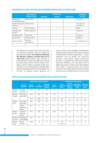 - la finalisation de la prospective financière passe par une troisième et dernière étape, qui intègre aux prévisions précédentes les incidences financières des décisions politiques nouvelles prises par la collectivité (programmation). Elles traduisent en termes financiers l'impact des différentes mesures qui seront mises en œuvre dans les années à venir. Celles-ci peuvent relever de politique fiscale (taux, contrôles accrus et identification de nouvelles bases fiscales), de politique foncière et d'aménagement du territoire, de politique tarifaire appliquée aux