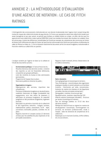 ANNEXE 2 : LA MÉTHODOLOGIE D'ÉVALUATION D'UNE AGENCE DE NOTATION : LE CAS DE FITCH RATINGS L'hétérogénéité des environnements institutionnels est une donnée fondamentale dont l'agence tient compte lorsqu'elle évalue les risques des collectivités locales de pays donnés. En France, par exemple les statuts des collectivités locales sont assez homogènes ce qui, pour autant, ne permet pas d'utiliser un modèle linéaire ou unique ; en effet, dès lors que l'on approche les rares collectivités à statut spécial (DOM-TOM, Corse), les modèles fournissent des résultats non valables. Dans les autres pays, il existe des différences considérables (en Suisse par exemple, les compétences des communes du Canton de Genève sont différentes de celles du Canton de Vaud, les lois communales de la Sicile sont particulières et différentes de celles du Piémont en Italie, etc...). D'où la nécessité d'examiner les documents ad-hoc de natures budgétaire, institutionnelle et financière relatifs aux collectivités en question.