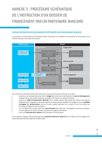 ANNEXE 3 : PROCÉDURE SCHÉMATIQUE DE L'INSTRUCTION D'UN DOSSIER DE FINANCEMENT PAR UN PARTENAIRE BANCAIRE SCHÉMA D’INSTRUCTION D’UNE DEMANDE DE PRÊT AUPRÈS D’UN ÉTABLISSEMENT BANCAIRE La procédure suivante présente les différentes étapes nécessaires à la validation d’une opération de financement d’une autorité locale par une banque commerciale :