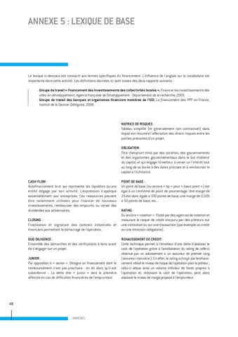 Le lexique ci-dessous est consacré aux termes spécifiques du financement. L'influence de l'anglais sur le vocabulaire est importante dans cette activité. Les définitions données ici sont issues des deux rapports suivants : - Groupe de travail « financement des investissements des collectivités locales », Financer les investissements des villes en développement, Agence française de Développement - Département de la recherche, 2005 - Groupe de travail des banques et organismes financiers membres de l'IGD, Le financement des PPP en France, Institut de la Gestion Déléguée, 2006