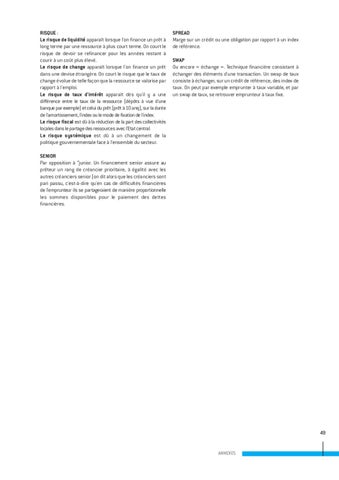 RISQUE : Le risque de liquidité apparaît lorsque l'on finance un prêt à long terme par une ressource à plus court terme. On court le risque de devoir se refinancer pour les années restant à courir à un coût plus élevé. Le risque de change apparaît lorsque l'on finance un prêt dans une devise étrangère. On court le risque que le taux de change évolue de telle façon que la ressource se valorise par rapport à l'emploi. Le risque de taux d'intérêt apparaît dès qu'il y a une différence entre le taux de la ressource (dépôts à vue d'une banque par exemple) et celui du prêt (prêt à 10 anq), sur la durée de l'amortissement, l'index ou le mode de fixation de l'index. Le risque fiscal est dû à la réduction de la part des collectivités locales dans le partage des ressources avec l'Etat central. Le risque systémique est dû à un changement de la politique gouvernementale face à l'ensemble du secteur.