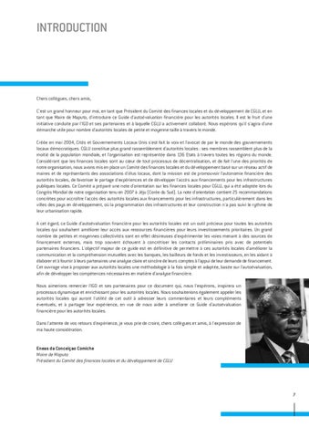 Chers collègues, chers amis, C'est un grand honneur pour moi, en tant que Président du Comité des finances locales et du développement de CGLU, et en tant que Maire de Maputo, d'introduire ce Guide d'autoévaluation financière pour les autorités locales. Il est le fruit d'une initiative conduite par l'IGD et ses partenaires et à laquelle CGLU a activement collaboré. Nous espérons qu'il s'agira d'une démarche utile pour nombre d'autorités locales de petite et moyenne taille à travers le monde. Créée en mai 2004, Cités et Gouvernements Locaux Unis s'est fait la voix et l'avocat de par le monde des gouvernements locaux démocratiques. CGLU constitue plus grand rassemblement d'autorités locales : ses membres rassemblent plus de la moitié de la population mondiale, et l'organisation est représentée dans 136 Etats à travers toutes les régions du monde. Considérant que les finances locales sont au cœur de tout processus de décentralisation, et de fait l'une des priorités de notre organisation, nous avons mis en place un Comité des finances locales et du développement basé sur un réseau actif de maires et de représentants des associations d'élus locaux, dont la mission est de promouvoir l'autonomie financière des autorités locales, de favoriser le partage d'expériences et de développer l'accès aux financements pour les infrastructures publiques locales. Ce Comité a préparé une note d'orientation sur les finances locales pour CGLU, qui a été adoptée lors du Congrès Mondial de notre organisation tenu en 2007 à Jéju (Corée du Sud). La note d'orientation contient 25 recommandations concrètes pour accroître l'accès des autorités locales aux financements pour les infrastructures, particulièrement dans les villes des pays en développement, où la programmation des infrastructures et leur construction n'a pas suivi le rythme de leur urbanisation rapide. A cet égard, ce Guide d'autoévaluation financière pour les autorités locales est un outil précieux pour toutes les autorités locales qui souhaitent améliorer leur accès aux ressources financières pour leurs investissements prioritaires. Un grand nombre de petites et moyennes collectivités sont en effet désireuses d'expérimenter les voies menant à des sources de financement externes, mais trop souvent échouent à concrétiser les contacts préliminaires pris avec de potentiels partenaires financiers. L'objectif majeur de ce guide est en définitive de permettre à ces autorités locales d'améliorer la communication et la compréhension mutuelles avec les banques, les bailleurs de fonds et les investisseurs, en les aidant à élaborer et à fournir à leurs partenaires une analyse claire et sincère de leurs comptes à l'appui de leur demande de financement. Cet ouvrage vise à proposer aux autorités locales une méthodologie à la fois simple et adaptée, basée sur l'autoévaluation, afin de développer les compétences nécessaires en matière d'analyse financière. Nous aimerions remercier l'IGD et ses partenaires pour ce document qui, nous l'espérons, inspirera un processus dynamique et enrichissant pour les autorités locales. Nous souhaiterions également appeler les autorités locales qui auront l'utilité de cet outil à adresser leurs commentaires et leurs compléments éventuels, et à partager leur expérience, en vue de nous aider à améliorer ce Guide d'autoévaluation financière pour les autorités locales. Dans l'attente de vos retours d'expérience, je vous prie de croire, chers collègues et amis, à l'expression de ma haute considération.