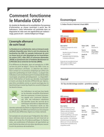 L’exemple allemand de suivi local Le Mandala est un outil pionnier, mais ce n’est pas la seule méthode disponible pour faire le suivi du processus de localisation des ODD. Un exemple intéressant de suivi au niveau local est celui développé par les Associations de cantons (LKT), villes (DST) et communes allemandes (DSGB) en partenariat avec la fondation Bertelsmann et le Ministère de la recherche territoriale (BBSR). À la différence du Mandala, dans cet exemple les 17 ODD servent de point de départ. Chacun des ODD a trois ou quatre indicateurs attribués. La sélection des indicateurs se base sur un processus analytique qui utilise une approche systématique et multi-niveaux. La plupart des indicateurs sont constitués à partir d’une base de données municipale actualisée périodiquement. La disponibilité de l’information et l’accès aux données municipales à travers une base de données différentiée par régions, peut être considérée comme un grand avantage pour le benchmarking et clustering d’après les caractéristiques et les besoins locaux. Les indicateurs ne sont pas tous basés Top sur les données recueillies directement Down dans les communes, à travers le processus appelé suivi communal (bottomBottom up). 10% des indicateurs requièrent Up des données issues des services de la statistique nationale ou régionale (topdown). Ces indicateurs basés sur des données nationales facilitent un alignement avec les indicateurs globaux des ODD et permettent aussi de comparer les efforts des différentes régions au niveau national. Cet exemple est une preuve que l’intégration des indicateurs nationaux dans le processus de suivi local est un élément clé à des fins d’incidence politique. En d’autres mots, une combinaison d’indicateurs de type bottom-up avec d’autres top-down est une valeur ajoutée pour assurer le suivi du processus de localisation.