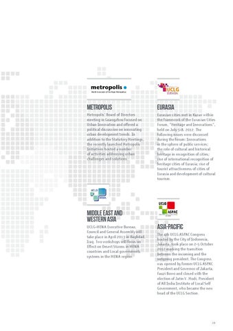 MIDDLE EAST AND WESTERN ASIA UCLG-MEWA Executive Bureau, Council and General Assembly will take place in April 2013 in Baghdad, Iraq. Two workshops will focus on Effect on Desert Storms in MEWA countries and Local governments systems in the MEWA region.
