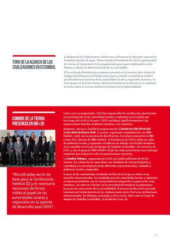 Como socio co-organizador, CGLU fue responsable de coordinar las aportaciones y la participación de las autoridades locales y regionales en la Cumbre que tuvo lugar del 20 al 22 de junio. CGLU contribuyó significativamente a las negociaciones formales mediante consultas a sus miembros. Asimismo, convocó y facilitó la preparación de la Sesión de Alto Nivel del 23 de abril en Nueva York. La sesión, organizada conjuntamente con ONUHabitat, contó con la presencia de Ban Ki-moon, Secretario General de la ONU, y Joan Clos, Director de ONU-Habitat. La Presidencia de CGLU y todas las redes de gobiernos locales y regionales entablaron un diálogo con Estados miembros clave reunidos en el Grupo de Amigos de Ciudades Sostenibles. Por iniciativa de CGLU, y con el apoyo de ORU-FOGAR e ICLEI, las redes presentaron unos mensajes conjuntos que incluyeron ocho recomendaciones concretas. La Cumbre Urbana, organizada por CGLU y la ciudad anfitriona de Rio de Janeiro, fue celebrada en Copacabana con alrededor de 300 participantes y contribuyó a la convergencia de las diferentes representaciones: ciudades y gobiernos locales y regionales.
