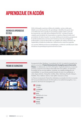 A propuesta de Wan Qingliang, Co-presidente de CGLU, la ciudad de Guangzhou ha puesto en marcha el Premio Internacional de Guangzhou para la Innovación Urbana, en colaboración con CGLU y Metropolis. El galardón alentará y reconocerá prácticas y proyectos innovadores destacables del sector público, en especial en los ámbitos de los servicios públicos, la gestión, las ciudades inteligentes y la sostenibilidad. 15 casos fueron preseleccionados de entre 255 candidaturas, a saber: Aguascalientes, Chiang Rai, Curitiba, Dakar, Kaohsiung, Kocaeli, Lilongwe, Medellín, Perm, Sakhnin, Salerno, Seúl, Sylhet, Vancouver y Viena. La Primera Ceremonia de Premio fue celebrada en noviembre de 2012 en ocasión del Consejo de Administración de Metropolis en la ciudad de Guangzhou. Los 5 ganadores del Premio de Guangzhou son: