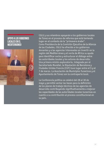 CGLU y sus miembros apoyarán a los gobiernos locales de Túnez en el proceso de reforma que está teniendo lugar en el contexto de la “primavera árabe”. Como Presidencia de la Comisión Ejecutiva de la Alianza de las Ciudades, CGLU ha ofrecido a los gobiernos donantes y a las agencias interesadas en invertir en la región del Mediterráneo y el norte de África su ayuda para identificar socios y estructurar el diálogo entre las autoridades locales y los actores de desarrollo. Una primera misión exploratoria, integrada por el Secretariado Mundial, la Diputación de Barcelona y Ciudades Unidas Francia (CUF) tuvo lugar entre el 5 y el 7 de marzo. La Asociación de Municipios Tunecinos y el Ayuntamiento de Túnez son la contraparte local. La Conferencia política se celebró del 28 al 30 de mayo y permitió sentar las bases para la definición de los planes de trabajo técnicos de las agencias de desarrollo contribuyendo significativamente a mejorar las capacidades de las autoridades locales tunecinas en cuanto a su contribución al proceso constitucional en su país.