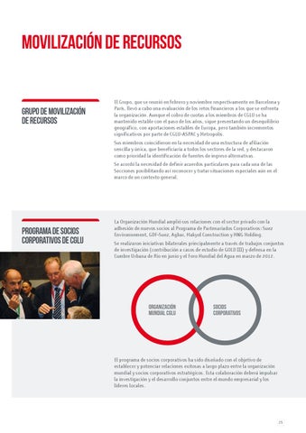 La Organización Mundial amplió sus relaciones con el sector privado con la adhesión de nuevos socios al Programa de Partenariados Corporativos: Suez Environnement, GDF-Suez, Agbar, Makyol Construction y MNG Holding. Se realizaron iniciativas bilaterales principalmente a través de trabajos conjuntos de investigación (contribución a casos de estudio de GOLD III) y defensa en la Cumbre Urbana de Rio en junio y el Foro Mundial del Agua en marzo de 2012.