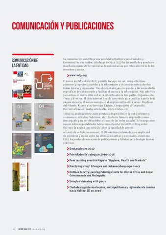 www.uclg.org El nuevo portal web de CGLU, permite trabajar en red, compartir ideas, promover proyectos y acceder a la información y el conocimiento sobre los temas locales y regionales. Ha sido diseñada para responder a las necesidades específicas de cada usuario y facilitar el acceso a la información. Más intuitivo y atractivo, el nuevo sitio web está estructurado en tres partes: Organización, Temas y Eventos. El sitio internet ha sido concebido para facilitar a partir de la página de inicio el acceso inmediato al amplio contenido, a saber: Objetivos del Milenio, Acceso a los Servicios Básicos, Cooperación al Desarrollo, Descentralización, Lobby ante las Naciones Unidas, etc. Todas las publicaciones serán puestas a disposición en la web (informes y resúmenes, artículos, boletines, etc.) tanto en formato imprimible como descargable para ser difundidos a través de las redes sociales. Se inauguraron nuevos sitios especializados tales como el portal de GOLD, el blog sobre Rio+20 y la página con noticias sobre la igualdad de género. A través de su Boletín mensual, CGLU mantiene informada a su amplia red de miembros y socios sobre las últimas iniciativas y novedades. Asimismo, CGLU ha producido una serie de publicaciones y folletos para divulgar buenas prácticas.