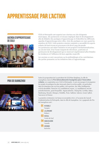 Suite à la proposition du Co-président de CGLU Wan Qingliang, la ville de Guangzhou a lancé le Prix International de Guangzhou pour l’innovation urbaine, en coopération avec CGLU et Metropolis. Ce prix encourage et récompense les projets et pratiques les plus innovants dans le secteur public, en particulier dans les domaines des services publics, de la gestion, des villes intelligentes et de la durabilité. Parmi les 255 candidatures reçues, 15 candidatures ont été présélectionnées, parmi lesquelles : Aguascalientes, Chiang Rai, Curitiba, Dakar, Kaohsiung, Kocaeli, Lilongwe, Medellin, Perm, Sakhnin, Salerno, Seoul, Sylhet, Vancouver et Vienne. La première cérémonie s’est tenue en novembre 2012, à l’occasion du Conseil d’administration de Metropolis, dans la ville de Guangzhou. Les 5 gagnants du Prix de Guangzhou sont :