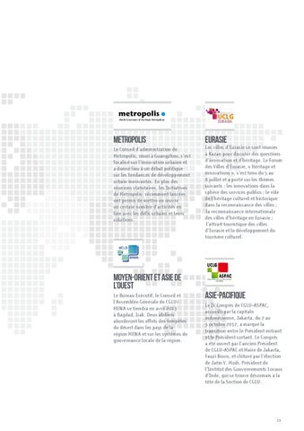 ASIE-PACIFIQUE Le IV Congrès de CGLU-ASPAC, accueilli par la capitale indonésienne, Jakarta, du 2 au 5 octobre 2012, a marqué la transition entre le Président entrant et le Président sortant. Le Congrès a été ouvert par l’ancien Président de CGLU-ASPAC et Maire de Jakarta, Fauzi Bowo, et clôturé par l’élection de Jatin V. Modi, Président de l’Institut des Gouvernements Locaux d’Inde, qui se trouve désormais à la tête de la Section de CGLU.