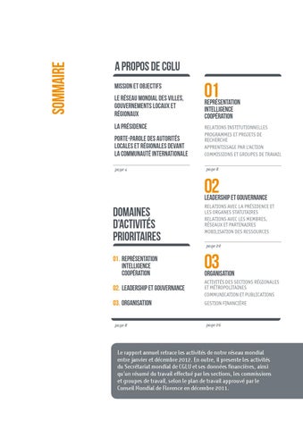 Le rapport annuel retrace les activités de notre réseau mondial entre janvier et décembre 2012. En outre, il presente les activités du Secrétariat mondial de CGLU et ses données financières, ainsi qu’un résumé du travail effectué par les sections, les commissions et groupes de travail, selon le plan de travail approuvé par le Conseil Mondial de Florence en décembre 2011.