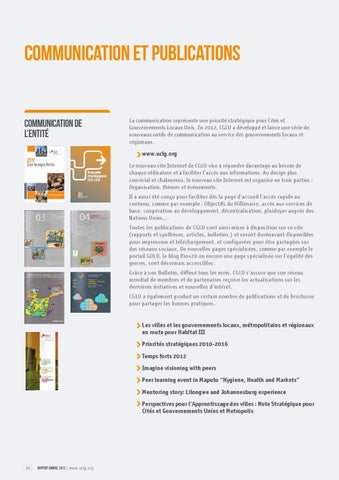 COMMUNICATION ET PUBLICATIONS La communication représente une priorité stratégique pour Cités et Gouvernements Locaux Unis. En 2012, CGLU a développé et lance une série de nouveaux outils de communication au service des gouvernements locaux et régionaux.