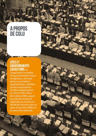 l’organisation mondiale des gouvernements locaux et régionaux, ainsi que de leurs associations représentatives. Héritière de deux organisations fondées respectivement en 1913 et 1957, elle a été créée en 2004, quand les autorités locales et régionales du monde ont décidé de fusionner pour se doter d’une voix unifiée sur la scène internationale.