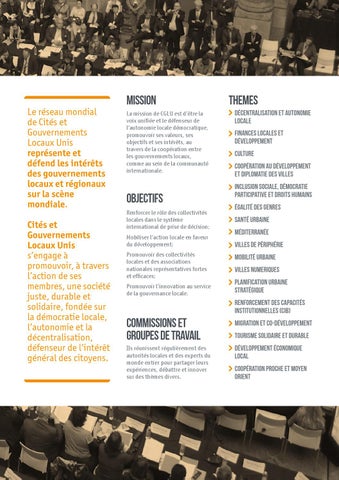 mission La mission de CGLU est d’être la voix unifiée et le défenseur de l’autonomie locale démocratique, promouvoir ses valeurs, ses objectifs et ses intérêts, au travers de la coopération entre les gouvernements locaux, comme au sein de la communauté internationale.