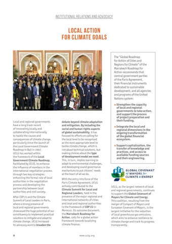 debate beyond climate adaptation and mitigation. By including the social and human rights aspects of global sustainability, it has focused its efforts on calling for the local level to be recognized as the most appropriate level to tackle climate change, which is not about technical solutions, but making choices about the type of development model we need. This, in turn, implies learning to adapt to environmental challenges, and developing sound governance mechanisms to put citizens’ needs at the heart of all we do. With the entry into force of the Paris Climate Agreement, UCLG actively contributed to the Climate Summit for Local and Regional Leaders, held in the presence of the major regional and international networks of cities and local and regional authorities in the framework of COP 22 in Morocco. Its outcome document, the Marrakech Roadmap for Action, calls for a global action framework towards localizing climate finance.