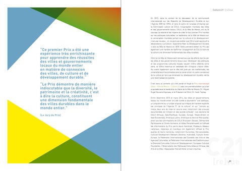 » dans la Ville de Mexico en 2010. Cette première édition du Prix est également une manière de réaffirmer l’engagement de CGLU à faire de la culture une dimension fondamentale des villes durables. CGLU et la Ville de Mexico sont convaincue que les efforts fournis par les villes et des gouvernements locaux pour développer des politiques et des programmes culturels réussis requiert d’être célébrés entre pairs, et d’être reconnus et visibilisés afin d’inspirer d’autre villes. Ils croient également que le rôle clef joué par les intellectuels, les universitaires et les activistes dans la construction du cadre conceptuel de la culture en tant que dimension du développement durable mérite une reconnaissance explicite. C’est dans ce contexte qu’a été pensé et forgé le Prix International CGLU – Ville de Mexico – Culture 21, avec une première édition qui s’est organisée sous le leadership du Maire de la Ville de Mexico, Dr. Miguel Ángel Mancera Espinosa, et le Président de CGLU, Dr. Kadir Topbaş. Entre décembre 2013 et mars 2014, les villes et gouvernements locaux du monde entier ont été invités à soumettre “une politique, un programme ou un projet original qui intégre de manière explicite les principes de l’Agenda 21 de la culture” et qui “compte au moins deux ans de mise en oeuvre avec notamment des preuves documentées de l’impact et des succés achevés”. Les sections de