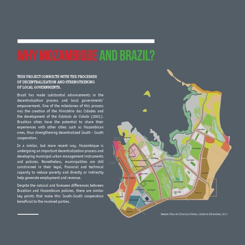 Why Mozambique and Brazil? THIS PROJECT CONNECTS WITH THE PROCESSES OF DECENTRALIZATION AND STRENGTHENING OF LOCAL GOVERNMENTS. Brazil has made substantial advancements in the decentralization process and local governments’ empowerment. One of the milestones of this process was the creation of the MinistÊrio das Cidades and the development of the Estatuto da Cidade (2001). Brazilian cities have the potential to share their experiences with other cities such as Mozambican ones, thus strengthening decentralized South - South cooperation. In a similar, but more recent way, Mozambique is undergoing an important decentralization process and developing municipal urban management instruments and policies. Nonetheless, municipalities are still constrained in their legal, financial and technical capacity to reduce poverty and directly or indirectly help generate employment and revenue. Despite the natural and foreseen differences between Brazilian and Mozambican policies, there are similar key points that make this South-South cooperation beneficial to the involved parties. Source: Plano de Estructura Urbana, cidade de Inhambane, 2013