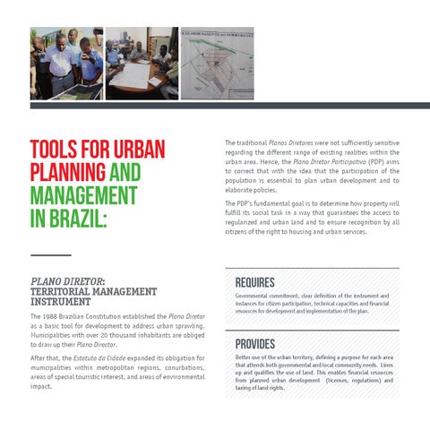 Tools for urban planning and management in Brazil: PLANO DIRETOR: TERRITORIAL MANAGEMENT INSTRUMENT The 1988 Brazilian Constitution established the Plano Diretor as a basic tool for development to address urban sprawling. Municipalities with over 20 thousand inhabitants are obliged to draw up their Plano Director. After that, the Estatuto da Cidade expanded its obligation for municipalities within metropolitan regions, conurbations, areas of special touristic interest, and areas of environmental impact.