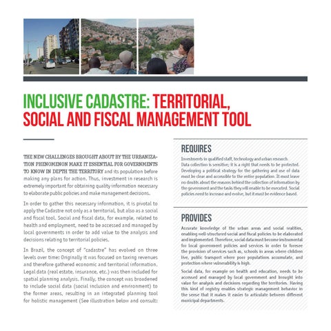 Inclusive Cadastre: territorial, social and fiscal management tool THE NEW CHALLENGES BROUGHT ABOUT BY THE URBANIZATION PHENOMENON MAKE IT ESSENTIAL FOR GOVERNMENTS TO KNOW IN DEPTH THE TERRITORY and its population before making any plans for action. Thus, investment in research is extremely important for obtaining quality information necessary to elaborate public policies and make management decisions. In order to gather this necessary information, it is pivotal to apply the Cadastre not only as a territorial, but also as a social and fiscal tool. Social and fiscal data, for example, related to health and employment, need to be accessed and managed by local governments in order to add value to the analysis and decisions relating to territorial policies. In Brazil, the concept of “cadastre� has evolved on three levels over time: Originally it was focused on taxing revenues and therefore gathered economic and territorial information. Legal data (real estate, insurance, etc.) was then included for spatial planning analysis. Finally, the concept was broadened to include social data (social inclusion and environment) to the former areas, resulting in an integrated planning tool for holistic management (See illustration below and consult: