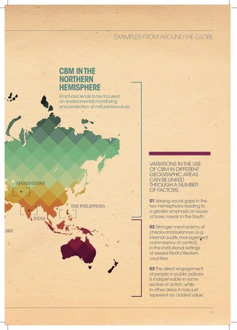 01 Varying social gaps in the two hemispheres leading to a greater emphasis on issues of basic needs in the South. 02 Stronger mechanisms of checks-and-balances (e.g. internal audits, management commissions of control) in the institutional settings of several North/Western countries. 03 The direct engagement of people in public policies is indispensable in some sectors of action, while in other areas it may just represent an ‘added value’.