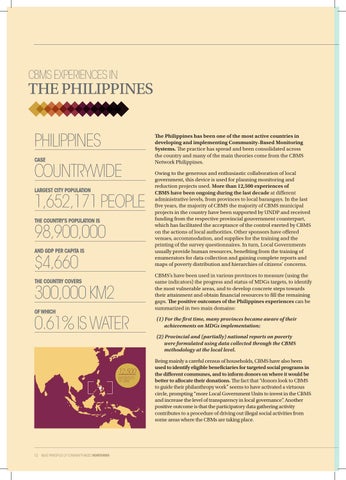 The Philippines has been one of the most active countries in developing and implementing Community-Based Monitoring Systems. The practice has spread and been consolidated across the country and many of the main theories come from the CBMS Network Philippines.