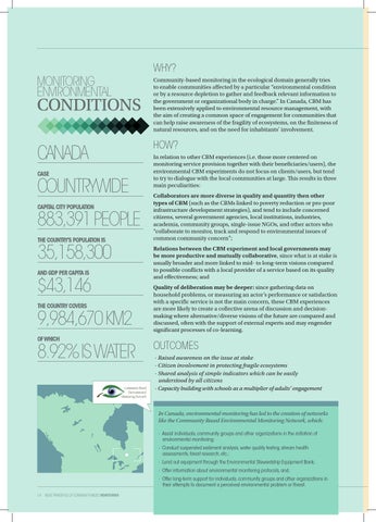 WHY? Community-based monitoring in the ecological domain generally tries to enable communities affected by a particular “environmental condition or by a resource depletion to gather and feedback relevant information to the government or organizational body in charge.” In Canada, CBM has been extensively applied to environmental resource management, with the aim of creating a common space of engagement for communities that can help raise awareness of the fragility of ecosystems, on the finiteness of natural resources, and on the need for inhabitants’ involvement.
