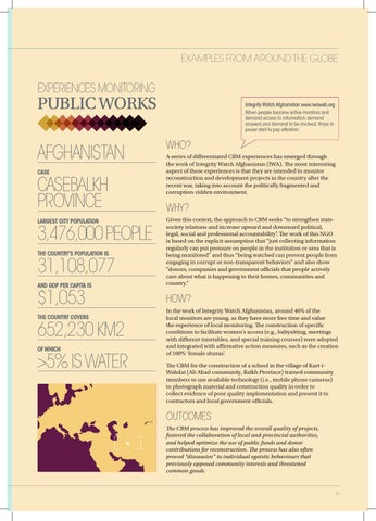 WHO? A series of differentiated CBM experiences has emerged through the work of Integrity Watch Afghanistan (IWA). The most interesting aspect of these experiences is that they are intended to monitor reconstruction and development projects in the country after the recent war, taking into account the politically fragmented and corruption-ridden environment.