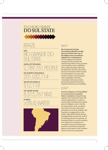 WHY? Rio Grande do Sul State Government (Brazil) recently discovered that it has one of the highest rates of roadways subjected to a toll payment (18.52% against the national average of 5.6%) and that the outsourcing of this service to private concessionaries (since 1998) has been malfunctioning. Following the 2010 State elections, the newly elected Government of Rio Grande do Sul decided to not renew the contract of three concessionaries and to gradually reactivate a ‘community toll system’, which previously existed but had been emptied of functions and visibility.