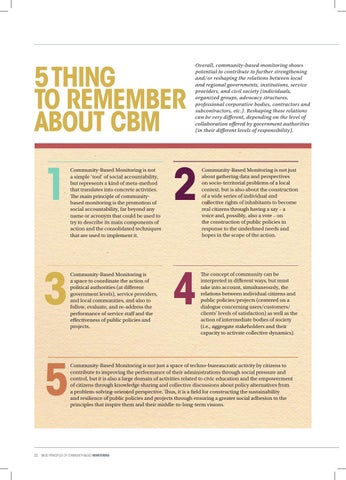 Community-Based Monitoring is not a simple ‘tool’ of social accountability, but represents a kind of meta-method that translates into concrete activities. The main principle of communitybased monitoring is the promotion of social accountability, far beyond any name or acronym that could be used to try to describe its main components of action and the consolidated techniques that are used to implement it.