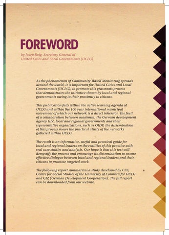 As the phenomenon of Community-Based Monitoring spreads around the world, it is important for United Cities and Local Governments (UCLG), to promote this grassroots process that demonstrates the initiative shown by local and regional governments owing to their proximity to citizens. This publication falls within the active learning agenda of UCLG and within the 100 year international municipal movement of which our network is a direct inheritor. The fruit of a collaboration between academia, the German development agency GIZ, local and regional governments and their representative organizations, such as OIDP, the dissemination of this process shows the practical utility of the networks gathered within UCLG. The result is an informative, useful and practical guide for local and regional leaders on the realities of this practice with real case studies and analysis. Our hope is that this text will demystify the process and encourage its dissemination to ensure effective dialogue between local and regional leaders and their citizens to promote targeted work. The following report summarizes a study developed by CES, Centre for Social Studies of the University of Coimbra for UCLG and GIZ (German Development Cooperation). The full report can be downloaded from our website.