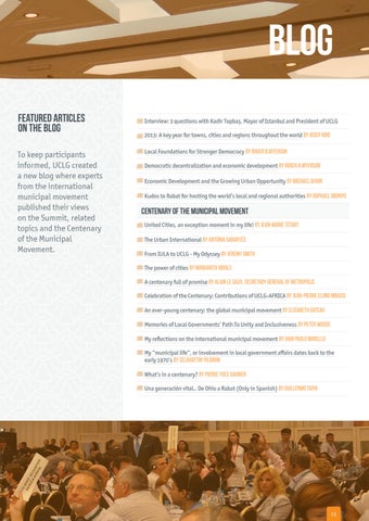 blog Featured articles on the blog To keep participants informed, UCLG created a new blog where experts from the international municipal movement published their views on the Summit, related topics and the Centenary of the Municipal Movement.