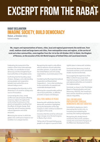 We, mayors and representatives of towns, cities, local and regional governments the world over, from small, medium-sized and large towns and cities, from metropolitan areas and regions, at the service of rural and urban communities, come together from the 1st to the 4th October 2013 in Rabat, the Kingdom of Morocco, on the occasion of the 4th World Congress of United Cities and Local Governments