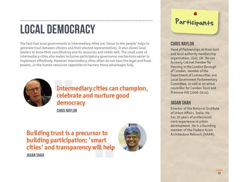 LOCAL DEMOCRACY The fact that local governments in intermediary cities are ‘closer to the people’ helps to generate trust between citizens and their elected representatives. It also allows local leaders to know their constituency and its resources and needs well. The small scale of intermediary cities also makes inclusive participatory governance mechanisms easier to implement effectively. However intermediary cities often do not have the legal and fiscal powers, or the human resources capacities to harness these advantages fully.