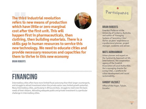 FINANCING Intermediary cities often have more limited fiscal autonomy than their larger counterparts, and struggle to attract investment when the private sector sees limited growth potential. Many intermediary cities, particularly in Africa and Asia, struggle to meet even the basic needs of their citizens. Attracting adequate public and private investment is a particular challenge in intermediary cities.