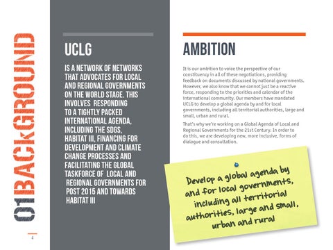 is a network of networks that advocates for local and regional governments on the world stage. This involves responding to a tightly packed international agenda, including the SDGs, Habitat III, Financing for Development and Climate Change processes and facilitating the Global Taskforce of local and Regional Governments for Post 2015 and Towards Habitat III