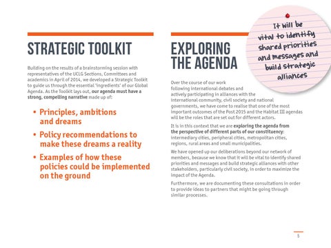 STRATEGIC TOOLKIT Building on the results of a brainstorming session with representatives of the UCLG Sections, Committees and academics in April of 2014, we developed a Strategic Toolkit to guide us through the essential âingredientsâ of our Global Agenda. As the Toolkit lays out, our agenda must have a strong, compelling narrative made up of: