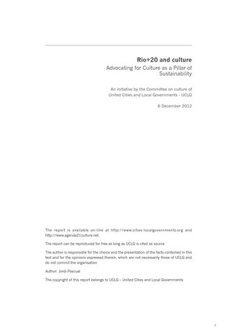 The report is available on-line at http://www.cities-localgovernments.org and http://www.agenda21culture.net. The report can be reproduced for free as long as UCLG is cited as source The author is responsible for the choice and the presentation of the facts contained in this text and for the opinions expressed therein, which are not necessarily those of UCLG and do not commit the organisation Author: Jordi Pascual The copyright of this report belongs to UCLG – United Cities and Local Governments