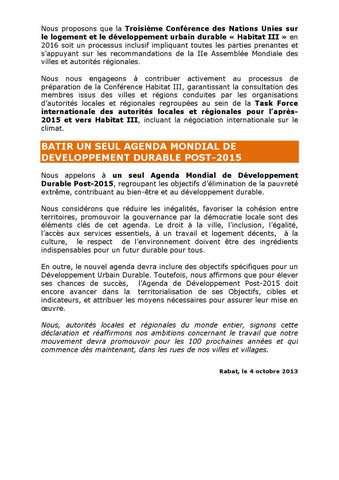 BATIR UN SEUL AGENDA MONDIAL DE DEVELOPPEMENT DURABLE POST-2015 Nous appelons à un seul Agenda Mondial de Développement Durable Post-2015, regroupant les objectifs d’élimination de la pauvreté extrême, contribuant au bien-être et au développement durable. Nous considérons que réduire les inégalités, favoriser la cohésion entre territoires, promouvoir la gouvernance par la démocratie locale sont des éléments clés de cet agenda. Le droit à la ville, l’inclusion, l’égalité, l’accès aux services essentiels, à un travail et logement décents, à la culture, le respect de l’environnement doivent être des ingrédients indispensables pour un futur durable pour tous. En outre, le nouvel agenda devra inclure des objectifs spécifiques pour un Développement Urbain Durable. Toutefois, nous affirmons que pour élever ses chances de succès, l’Agenda de Développement Post-2015 doit encore avancer dans la territorialisation de ses Objectifs, cibles et indicateurs, et attribuer les moyens nécessaires pour assurer leur mise en œuvre. Nous, autorités locales et régionales du monde entier, signons cette déclaration et réaffirmons nos ambitions concernant le travail que notre mouvement devra promouvoir pour les 100 prochaines années et qui commence dès maintenant, dans les rues de nos villes et villages. Rabat, le 4 octobre 2013