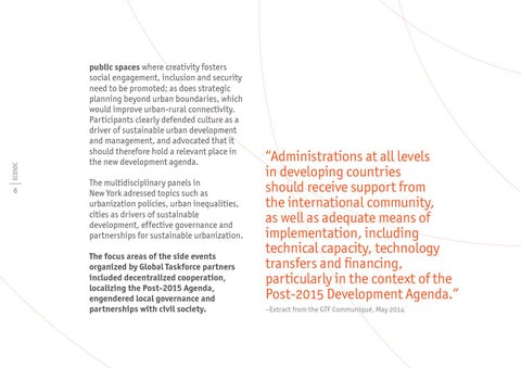 public spaces where creativity fosters social engagement, inclusion and security need to be promoted; as does strategic planning beyond urban boundaries, which would improve urban-rural connectivity. Participants clearly defended culture as a driver of sustainable urban development and management, and advocated that it should therefore hold a relevant place in the new development agenda. The multidisciplinary panels in New York adressed topics such as urbanization policies, urban inequalities, cities as drivers of sustainable development, effective governance and partnerships for sustainable urbanization. The focus areas of the side events organized by Global Taskforcepartners included decentralized cooperation, localizing the Post-2015 Agenda, engendered local governance and partnerships with civil society.