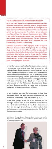 The “Local Government Millennium Declaration” On 10 June 2005, Mayors and local government representatives from around the world committed themselves directly to the global efforts to achieve the Millennium Development Goals by adopting their own “Local Government Millennium Declaration.” This was an important symbolic step that demonstrated the dedication of local authorities around the world and their citizens to the achievement of the MDGs. It also marked an important milestone in the relationship between local authorities and the Millennium Campaign. The Local Government Millennium Declaration was adopted at the United Cities and Local Governments (UCLG) World Council in Beijing. Further, the UCLG World Council in Beijing also created its very own Millennium Development Goals Working Group. The new Working Group is chaired by the City of Rome and has an international secretariat coordinated by Coordination of Local Authorities for Peace and Human Rights, which is based in Perugia, Italy. The Working Group met at the 5th Forum of the World Alliance of Cities Against Poverty (WACAP) in March 2006, and presented its first Plan of Action, covering the period 2006-2007.
