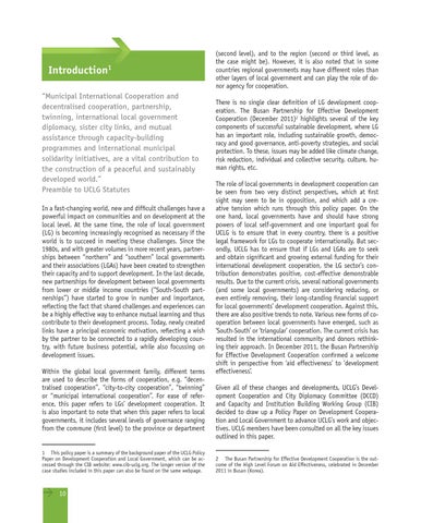 (second level), and to the region (second or third level, as the case might be). However, it is also noted that in some countries regional governments may have different roles than other layers of local government and can play the role of donor agency for cooperation. There is no single clear definition of LG development cooperation. The Busan Partnership for Effective Development Cooperation (December 2011)2 highlights several of the key components of successful sustainable development, where LG has an important role, including sustainable growth, democracy and good governance, anti-poverty strategies, and social protection. To these, issues may be added like climate change, risk reduction, individual and collective security, culture, human rights, etc. The role of local governments in development cooperation can be seen from two very distinct perspectives, which at first sight may seem to be in opposition, and which add a creative tension which runs through this policy paper. On the one hand, local governments have and should have strong powers of local self-government and one important goal for UCLG is to ensure that in every country, there is a positive legal framework for LGs to cooperate internationally. But secondly, UCLG has to ensure that if LGs and LGAs are to seek and obtain significant and growing external funding for their international development cooperation, the LG sector’s contribution demonstrates positive, cost-effective demonstrable results. Due to the current crisis, several national governments (and some local governments) are considering reducing, or even entirely removing, their long-standing financial support for local governments’ development cooperation. Against this, there are also positive trends to note. Various new forms of cooperation between local governments have emerged, such as ‘South-South’ or ‘triangular’ cooperation. The current crisis has resulted in the international community and donors rethinking their approach. In December 2011, the Busan Partnership for Effective Development Cooperation confirmed a welcome shift in perspective from ‘aid effectiveness’ to ‘development effectiveness’. Given all of these changes and developments, UCLG’s Development Cooperation and City Diplomacy Committee (DCCD) and Capacity and Institution Building Working Group (CIB) decided to draw up a Policy Paper on Development Cooperation and Local Government to advance UCLG’s work and objectives. UCLG members have been consulted on all the key issues outlined in this paper. 2 The Busan Partnership for Effective Development Cooperation is the outcome of the High Level Forum on Aid Effectiveness, celebrated in December 2011 in Busan (Korea).