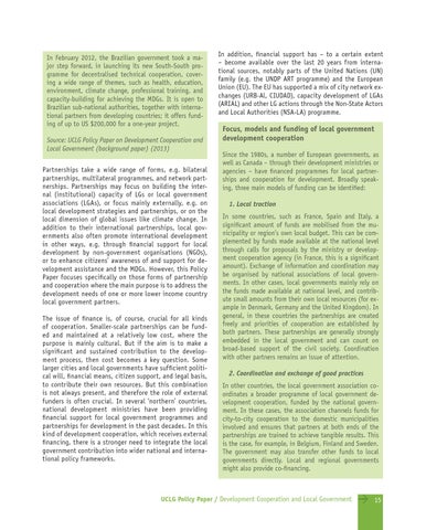In February 2012, the Brazilian government took a major step forward, in launching its new South-South programme for decentralised technical cooperation, covering a wide range of themes, such as health, education, environment, climate change, professional training, and capacity-building for achieving the MDGs. It is open to Brazilian sub-national authorities, together with international partners from developing countries; it offers funding of up to US $200,000 for a one-year project. Source: UCLG Policy Paper on Development Cooperation and Local Government (background paper) (2013) Partnerships take a wide range of forms, e.g. bilateral partnerships, multilateral programmes, and network partnerships. Partnerships may focus on building the internal (institutional) capacity of LGs or local government associations (LGAs), or focus mainly externally, e.g. on local development strategies and partnerships, or on the local dimension of global issues like climate change. In addition to their international partnerships, local governments also often promote international development in other ways, e.g. through financial support for local development by non-government organisations (NGOs), or to enhance citizens’ awareness of and support for development assistance and the MDGs. However, this Policy Paper focuses specifically on those forms of partnership and cooperation where the main purpose is to address the development needs of one or more lower income country local government partners. The issue of finance is, of course, crucial for all kinds of cooperation. Smaller-scale partnerships can be funded and maintained at a relatively low cost, where the purpose is mainly cultural. But if the aim is to make a significant and sustained contribution to the development process, then cost becomes a key question. Some larger cities and local governments have sufficient political will, financial means, citizen support, and legal basis, to contribute their own resources. But this combination is not always present, and therefore the role of external funders is often crucial. In several ‘northern’ countries, national development ministries have been providing financial support for local government programmes and partnerships for development in the past decades. In this kind of development cooperation, which receives external financing, there is a stronger need to integrate the local government contribution into wider national and international policy frameworks.