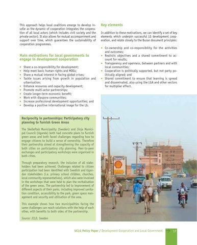 Reciprocity in partnerships: Participatory city planning to furnish Green Areas The Skellefteå Municipality (Sweden) and Jinja Municipal Council (Uganda) both had concrete plans to furnish green areas and both faced challenges regarding how to engage citizens to build a sense of ownership. Therefore their partnership aimed at strengthening the capacity of both cities on participatory city planning. Peer-to-peer exchanges and participatory workshops were organised in both cities. Through preparatory research, the inclusion of all stakeholders had been achieved. Challenges related to citizen participation had been identified with Swedish and Ugandan stakeholders (i.e. primary school children, churches, local community representatives), which also were involved in the workshops that were held to plan the revitalisation of the green areas. The partnership led to improvement of different aspects of their parks, including improved sanitation condition, accessibility to the park, green space management and security and utilisation of the area. This example shows how two municipalities facing the same challenges can reach solutions with the help of each other, with benefits to both sides of the partnership. Source: ICLD, Sweden