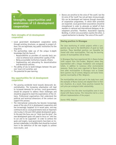 Sharing practices in Nicaragua The close monitoring of certain projects within a programme may lead to the identification of good (or bad) practices. These identified practices can thereafter be shared with other municipalities. That way the learning process of municipalities will be faster. In Nicaragua they have experienced this in Nueva Guinea (with support from Sint-Truiden, Belgium) where they experimented with a biogas installation and ecological toilets, in addition to numerous other environmental measures. Study tours were organised to Nueva Guinea from other municipalities in Nicaragua such as Ciudad Darío (partner city of Lommel, Belgium) and Santo Tomás (partner municipality of Mol, Belgium). The municipalities who took part in the study tours used the examples of Nueva Guinea and adapted them to their own situations. As a result, these practices lowered the unit price per ecological toilet substantially. New practices from the other municipalities were in turn shared with Nueva Guinea. This interaction led to a more efficient implementation of the project. Source: VVSG, Belgium